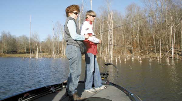 Ken Murphy gives pointers to Amy Giust while fishing the edge of standing timber. In addition to being a top angler, Murphy gives seminars and fishing instructions to new anglers.
