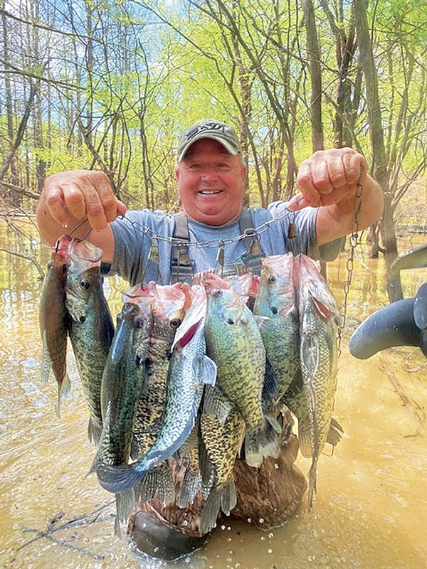 Slabbin-05 John Harrison with JH Guide Service shows off some crappie he caught on Grenada Lake while wading around flooded timber. During years with high water, fish get in the trees to spawn in the spring.